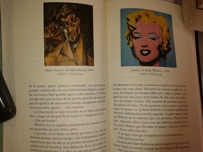 Mientras leía la obra de Steve Martín, no pude evitar el revivir las visitas a museos y galerías con mi curador particular con el que comparto ausencias y encuentros vitales. Él me enseñó lo poco que sé de arte contemporáneo. Y en un arrebato romántico, le envié un wats’up con una fotografía de las páginas 158 y 159 de este libro…Las elegí porque aparecen dos cuadros de pintores que Él admira: Mujer con peras, de Pablo  Picasso y Marilyn de Andy Warhol.