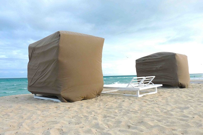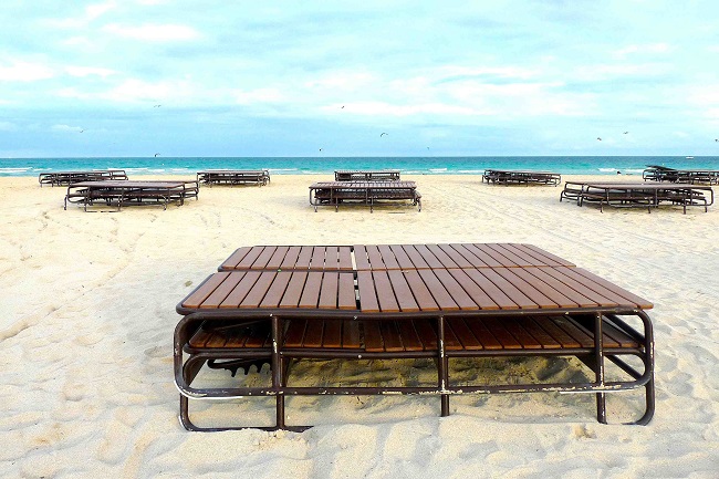 La zona del Beach de la 34 Collins Ave. donde se haya el Versailles se encontraba, cuando la artista comenzó la investigación hace ya más de una década, libre de la escenografía  actual  de infinitas hamacas, sombrillas uniformadas a modo de estandarte de la marca hotelera de turno, containers, y un sin fin de caóticos volúmenes que aumentan sin control, vetando el tránsito y el disfrute público por la playa y que terminan con la perspectivas del paisaje marítimo, privatizando el lugar y colocando verdaderos pasillos de  obstáculos entre la arena y la orilla del océano. Paisajes que, curiosamente, desparecen de las fotos promocionales de la industria turística, dónde las imágenes de exóticas palmeras serian los únicos elementos que se interponen entre el hotel y un verde mar en calma a modo de panorámico  paraiso caribeño.